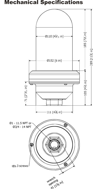 Supplied with standard 1” NPT and reducer bushing to 3/4” NPT threaded opening for rigid conduit Optional universal mounting bracket also available Electrical Specifications Input Voltage: 115VAC/230VAC (nominal) Environmental Specifications Temperature: -55°C to +55°C (-67°F to 130°F) Photometric Specifications Meets or exceeds: